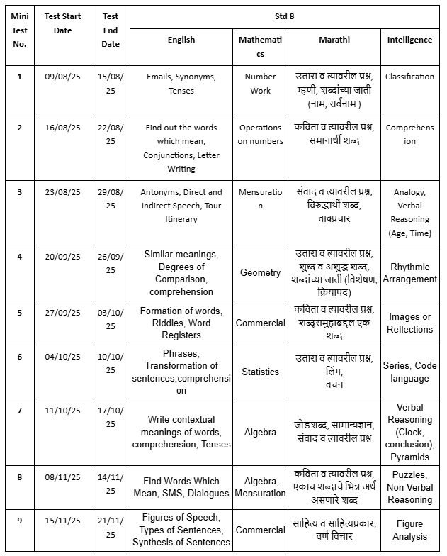 Std. 8 Scholarship : Mini Tests' Schedules